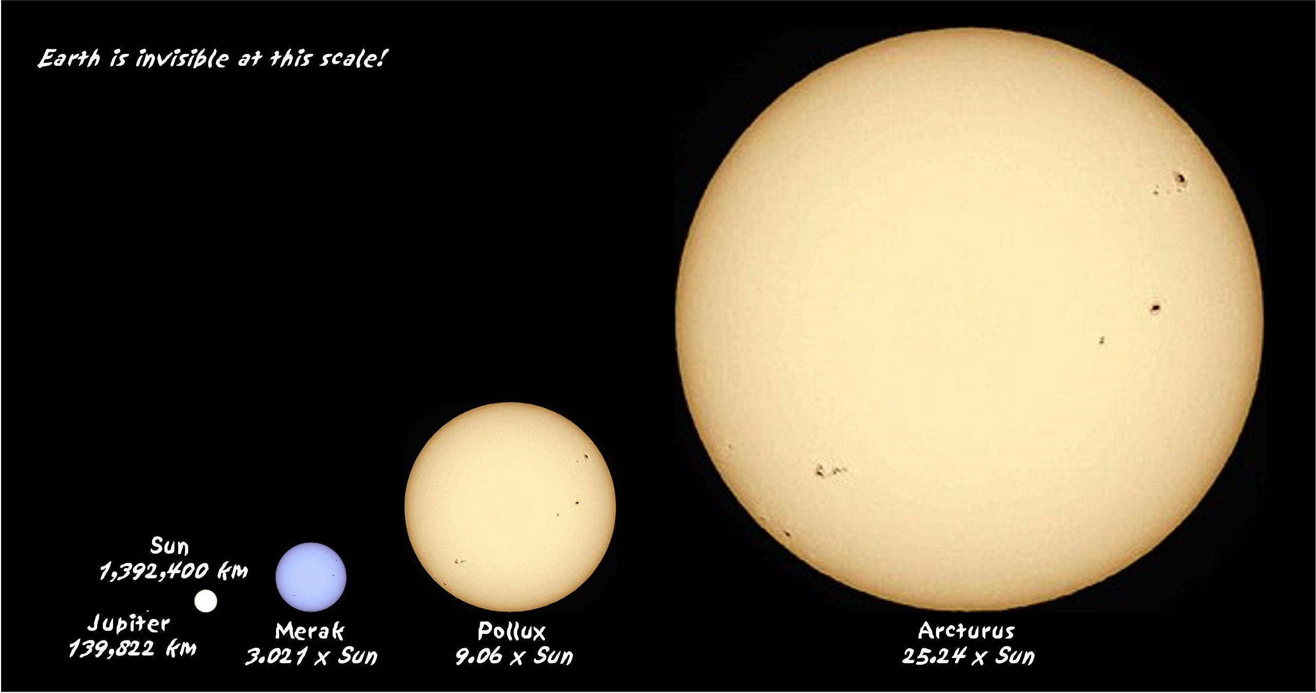 When it was contented middle-aged star and burning hydrogen in its core, Arcturus shone only modestly brighter than our sun. But the star has since entirely consumed its allotment of hydrogen and, without an energy source to push back, endured the iron hand of gravity squeezing its central region until it grew hot enough to burn hydrogen in a shell around an inert helium core. The fierce energy from the hydrogen burning shell ballooned out the star’s rarefied outer layers to some 25 solar diameters and increased its brightness to more than 170 suns. As they expanded, the outer layers cooled to a temperature of about 4,300 K which gives the star a tangerine hue that’s the signature of a mid-sized red giant star. The visible layers of the yellow-white sun have a temperature of about 5,700K.