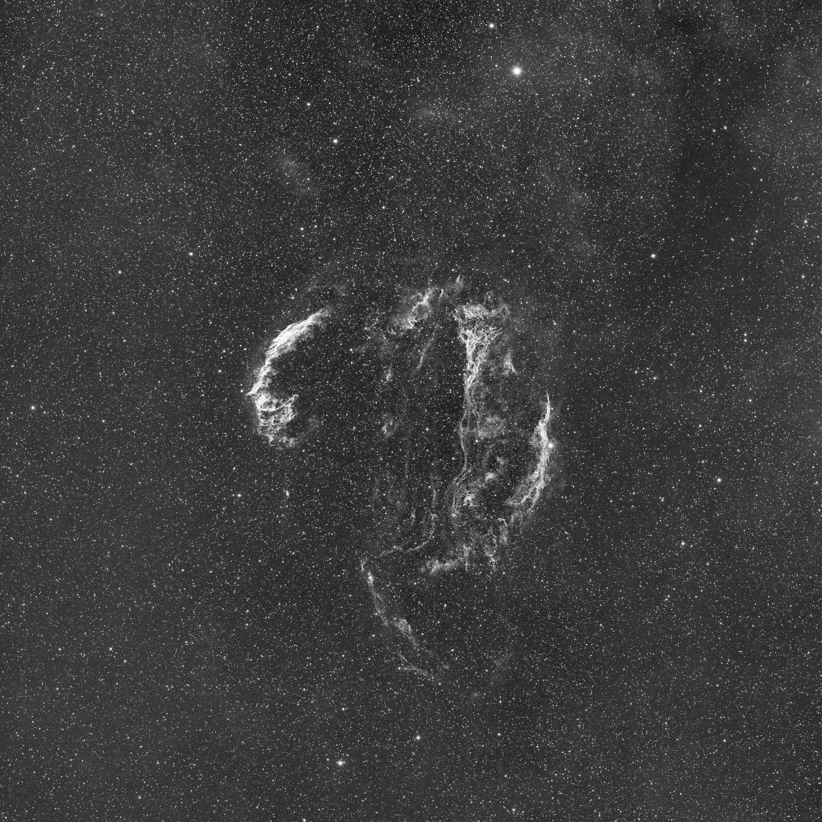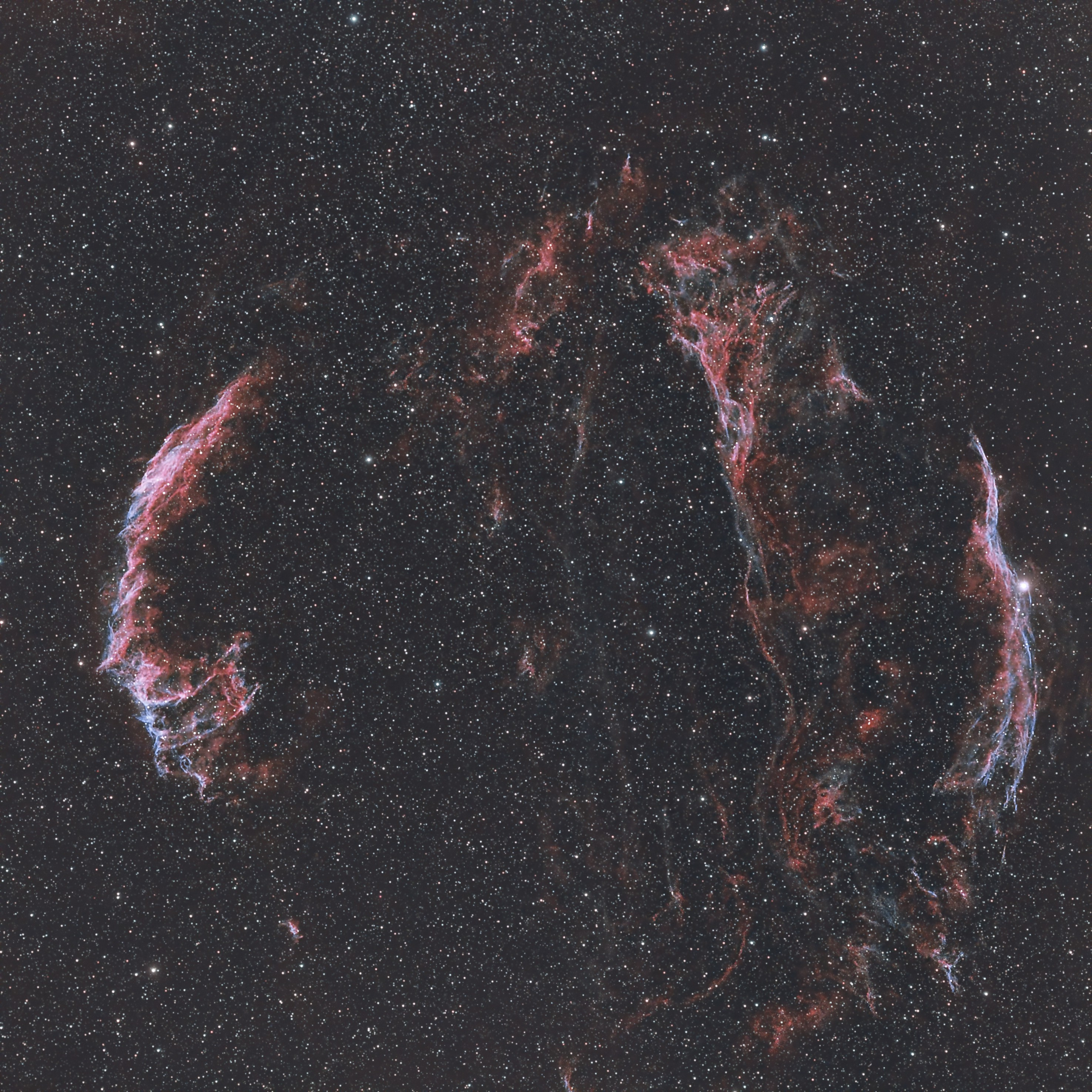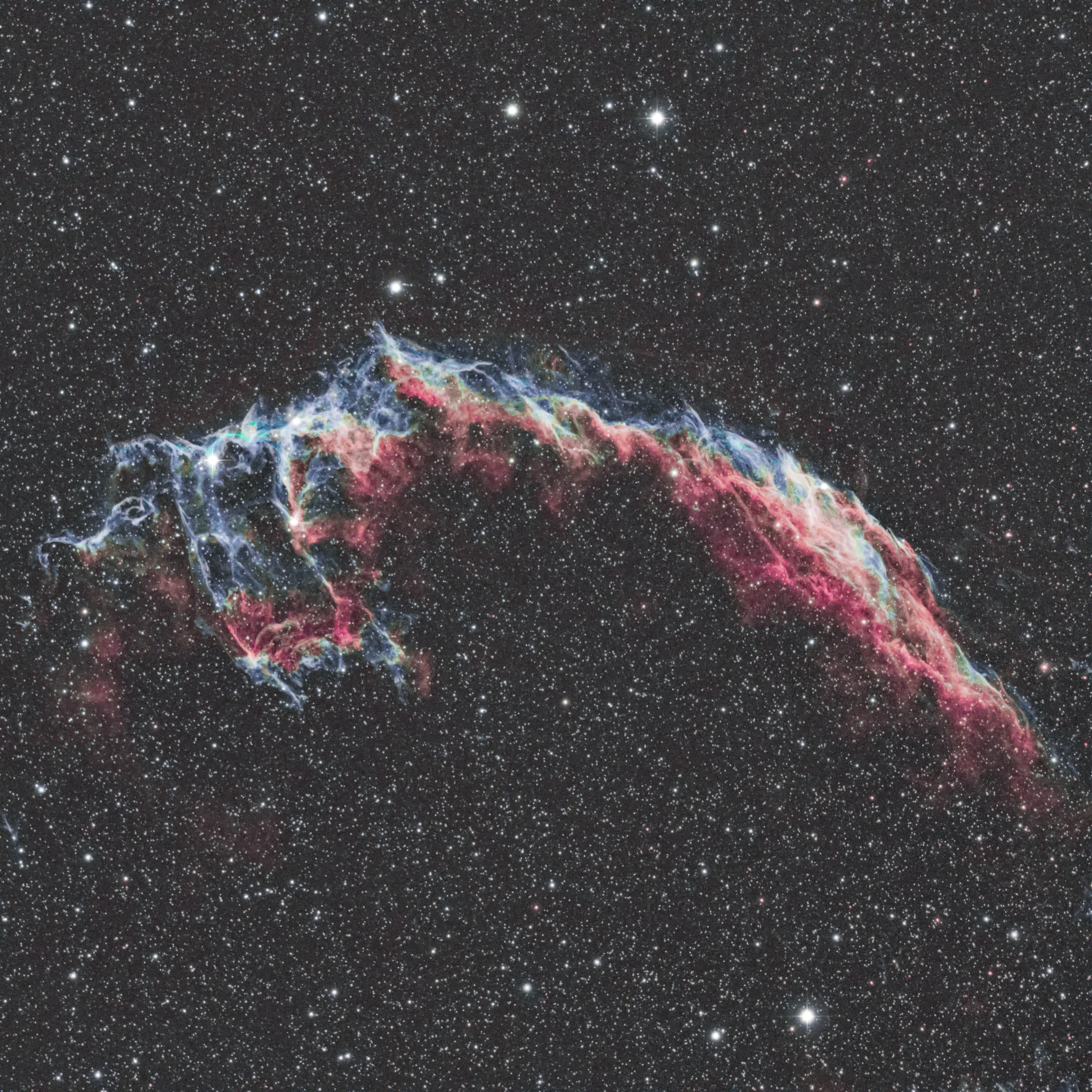 Since only the largest stars expire like this, and since the explosion itself plays out quickly over a few days or weeks, a supernova is a relatively rare event: the last known supernova in the Milky Way happened more than 400 years ago. Such explosions often leave a long-lasting imprint in the form of a visible nebula caused by the rapidly expanding shock wave. Dozens of these so-called supernova remnants fleck the night sky with evocative names like the Spaghetti Nebula, the Jellyfish Nebula, and the Manatee nebula. Most require a substantial amateur telescope and sensitive camera to detect. But except for the much smaller Crab Nebula, the sprawling Cygnus Loop is one of the easiest to see and photograph and one of the most intricate and intrinsically beautiful objects in our galaxy.